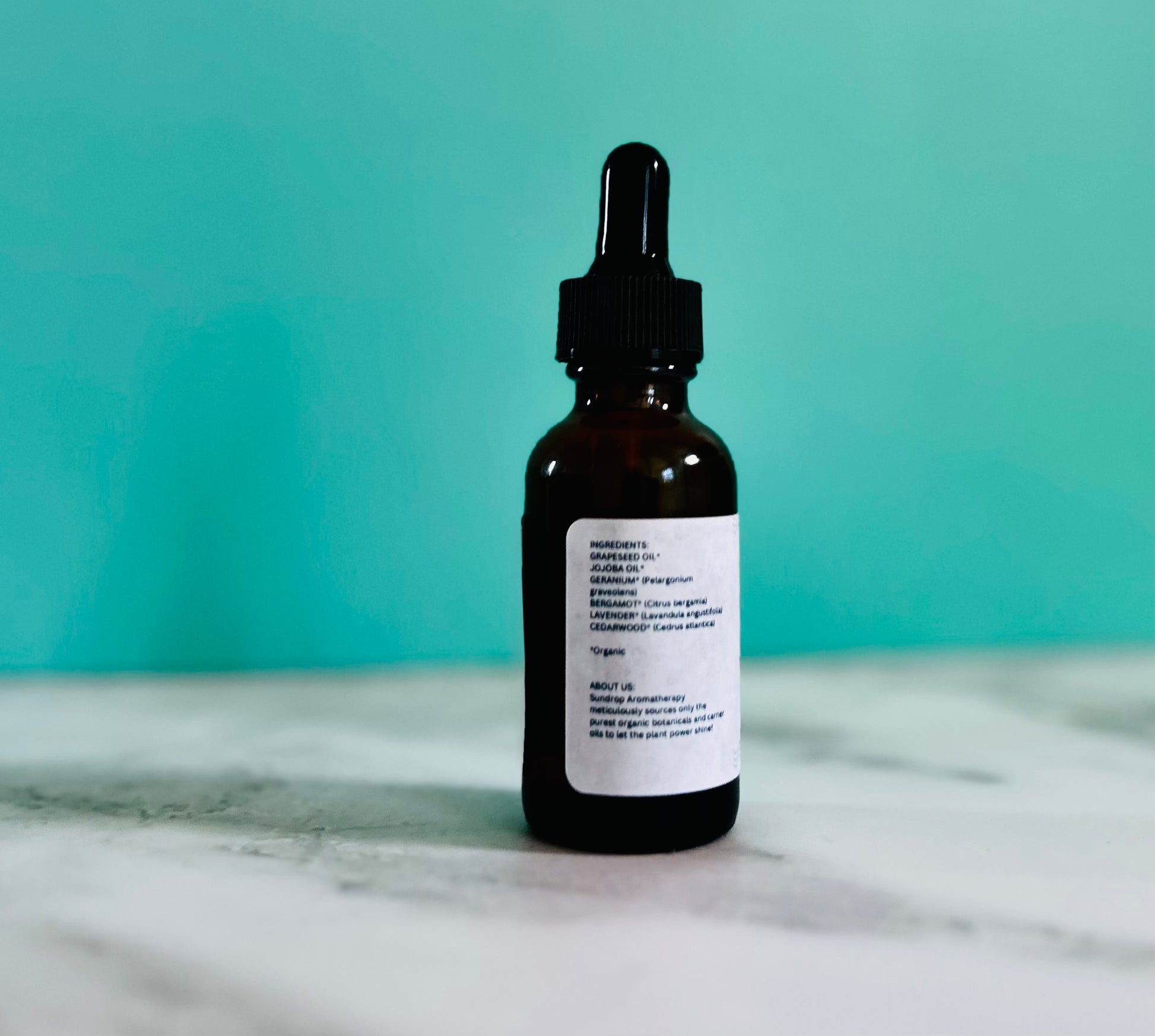 Ingredients: organic grapeseed oil, organic jojoba oil, organic lavender (Lavandula angustifolia), organic geranium (Pelargonium graveolens), organic cedarwood (Cedrus atlantica), organic bergamot (Citrus bergamia)