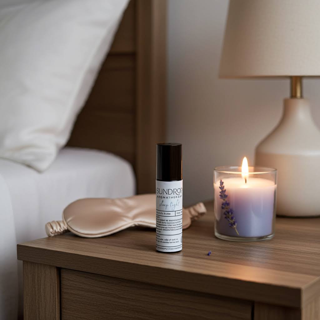 Massage onto temples, sides of neck, or bottoms of feet 30 minutes before bed.